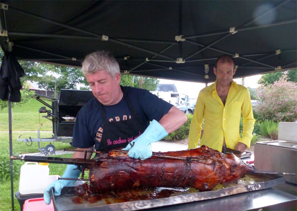 Le repas est assuré par « Le cochon qui roule » qui fait griller et sert le cochon sur place: attraction garantie! Des crêpes et galettes sont également préparées par un prestataire.